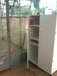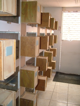 The zinc drawers can be seen. On top of the breeding cages is a zap machine for insects in the summary months. This is used at night.