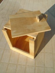 Picture on the left: The 20 bank breeding cage super wood entrance. The screws to hook the nest box can be seen above the hole.
