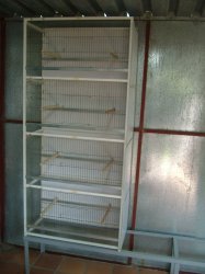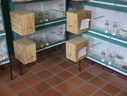 The 36 breeding cages area are units of 4 cages one above the other as a solid unit. The breeding cages are made from 10 mm square tubing as a frame to which the base and tops, made out of wood, are slotted in. Sand or paper is placed on the bottom of each cage below the perches. The fronts are clipped in and the nest boxes hang from the breeding cage frames. An access door on the breeding cage front provides access to the nest box.