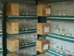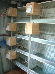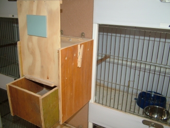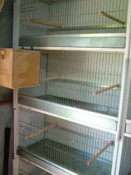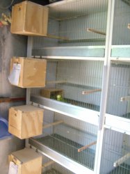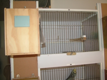 The 20 breeding cage area are units of 4 cages one above the other as the other units but do not offer the option of removing dividers to allow for a long breeding cage. The nest boxes are also hung against a strip of super wood which has the entrance hole drilled through it for access to the nest box. The base and tops of the breeding cages are wooden boards which slot in. There is no tray but sand or paper is placed on the bottom of each cage below the perches.