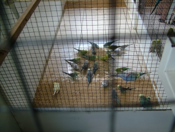 Picture on the right: Sand is placed below each perch area. The seed is spread on the ground which allows the birds to
