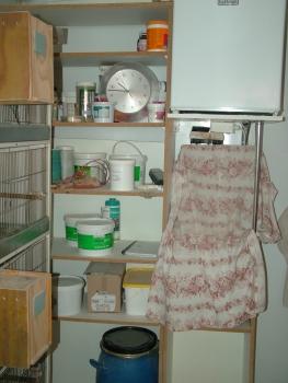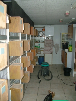 Picture on the left: At the end on the 36 bank of breeding cages shelving has been installed to hold various items.